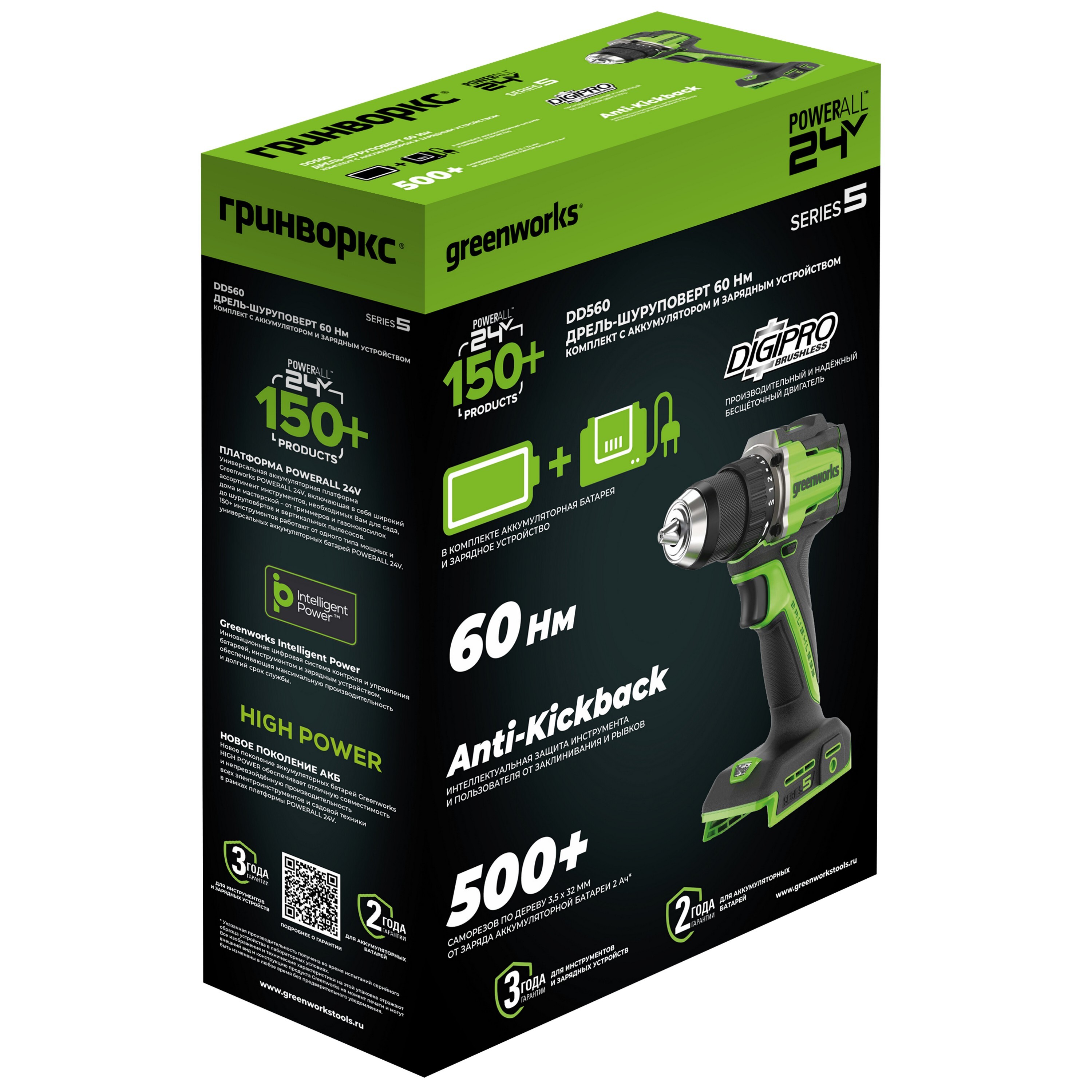 Дрель-шуруповерт акк. Greenworks DD560, 24V, б/щет, 30/60 Нм,13мм, Anti-kickback,1х4Ач,ЗУ,кор (3708407CUB)