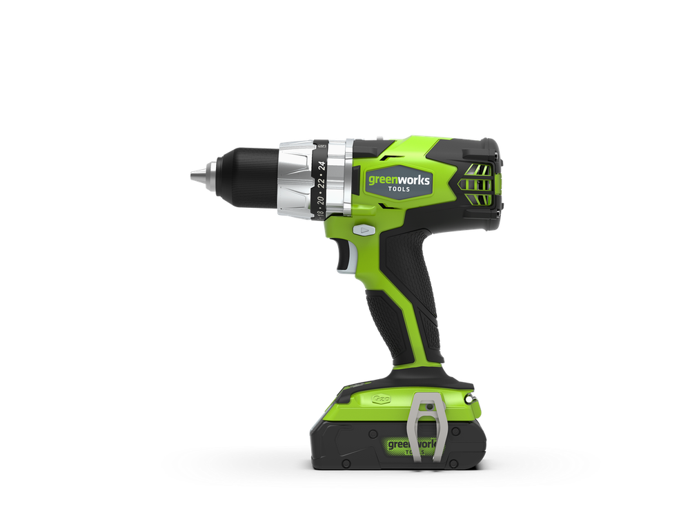 Дрель шуруповёрт аккумуляторная, бесщёточная Greenworks 24V (модель GD24DD) - полу профессиональная модель с новейшим индукционным (бесщеточным) двигателем DigiPro™ 2-го поколения. Предназначена для сверления без удара и закручивания/откручивания шурупов.