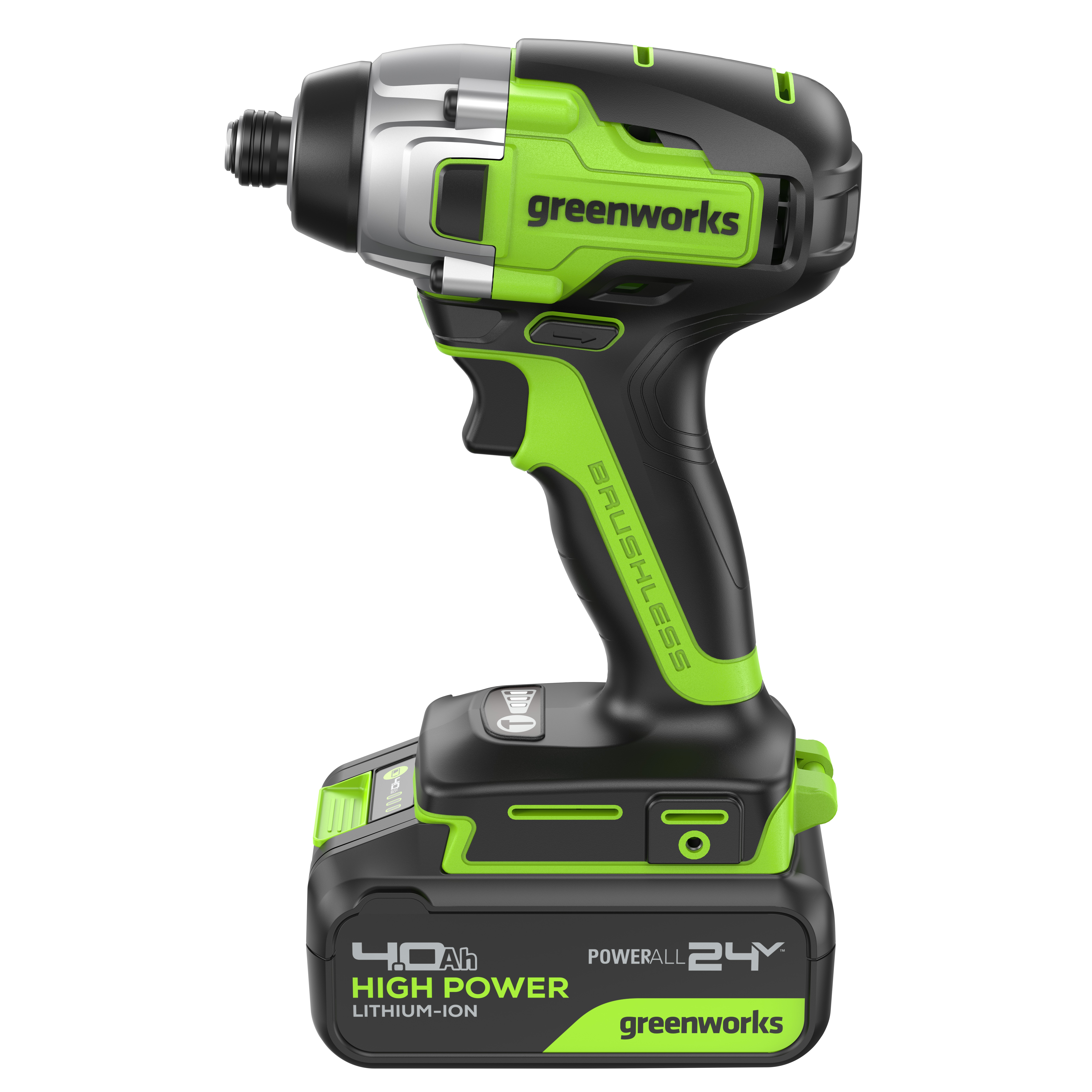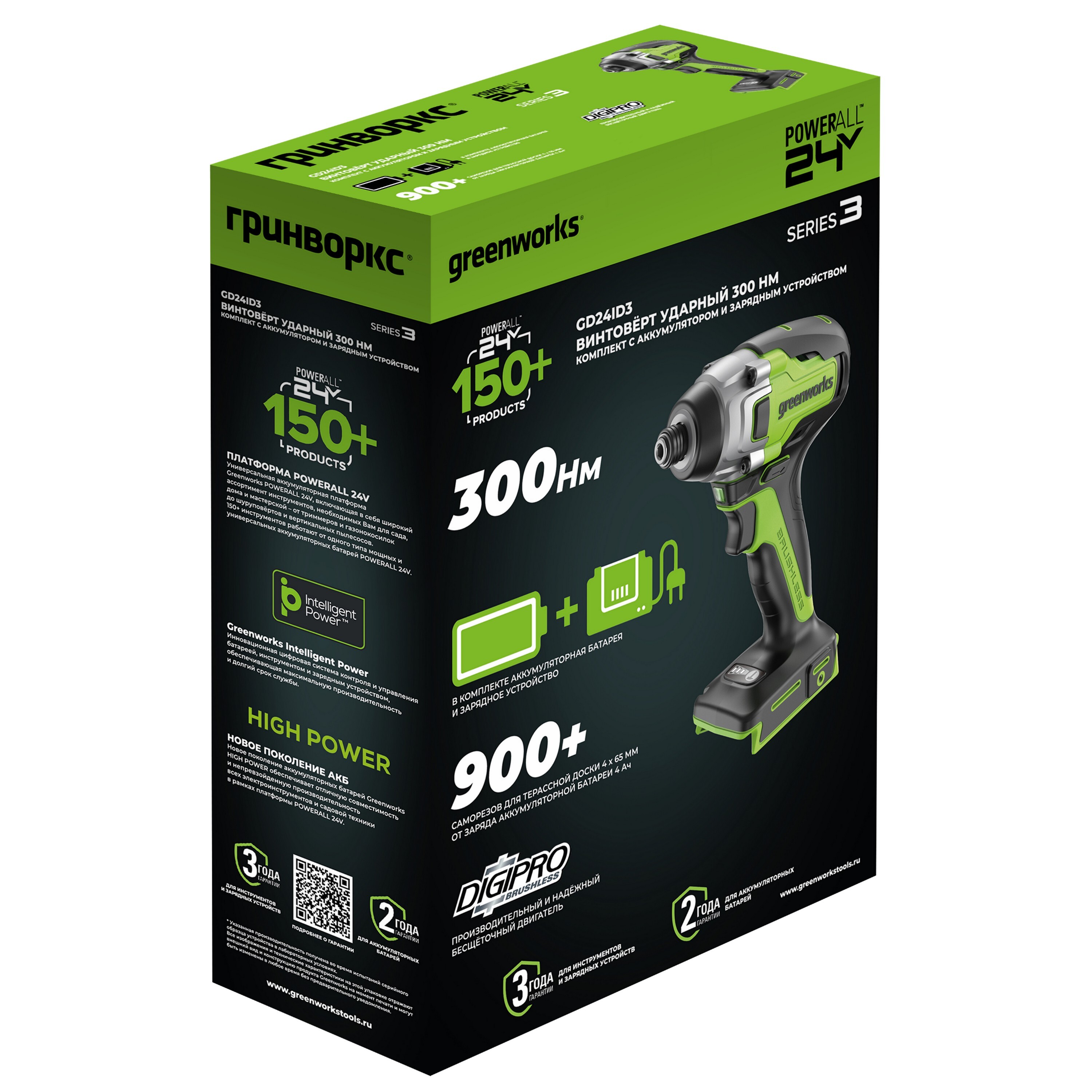 Винтоверт ударный акк. Greenworks GD24ID3, 24V, б/щет, 0-2800об/мин, 4000уд/мин, HEX 1/4, 300Нм, 3 режима,1x4Ач,ЗУ,кор (3802807CUB)
