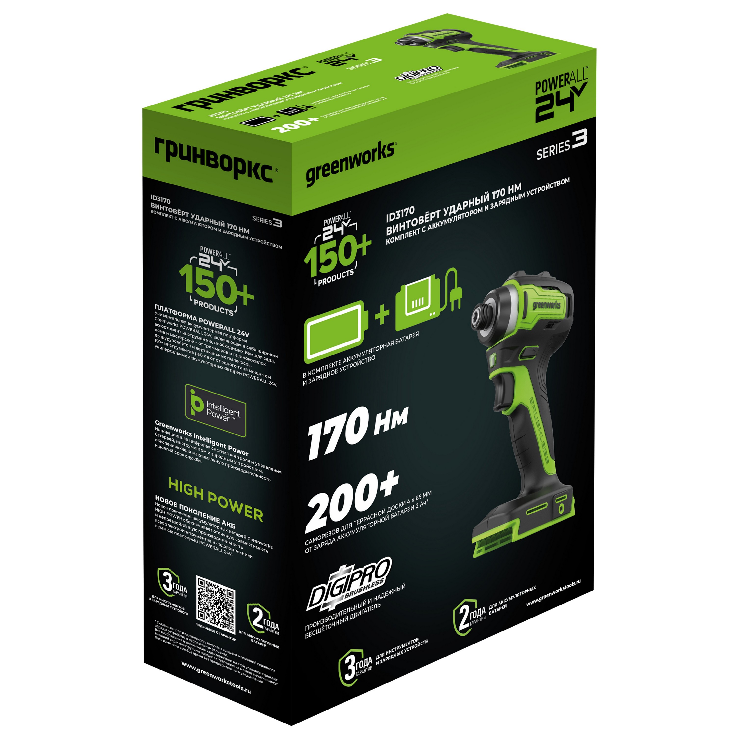 Винтоверт ударный акк. Greenworks ID3170, 24V, б/щет, 0-3200об/мин, 4000 уд/мин, HEX 1/4, 170Нм,1х2Ач,ЗУ,кор (3804907CUA)